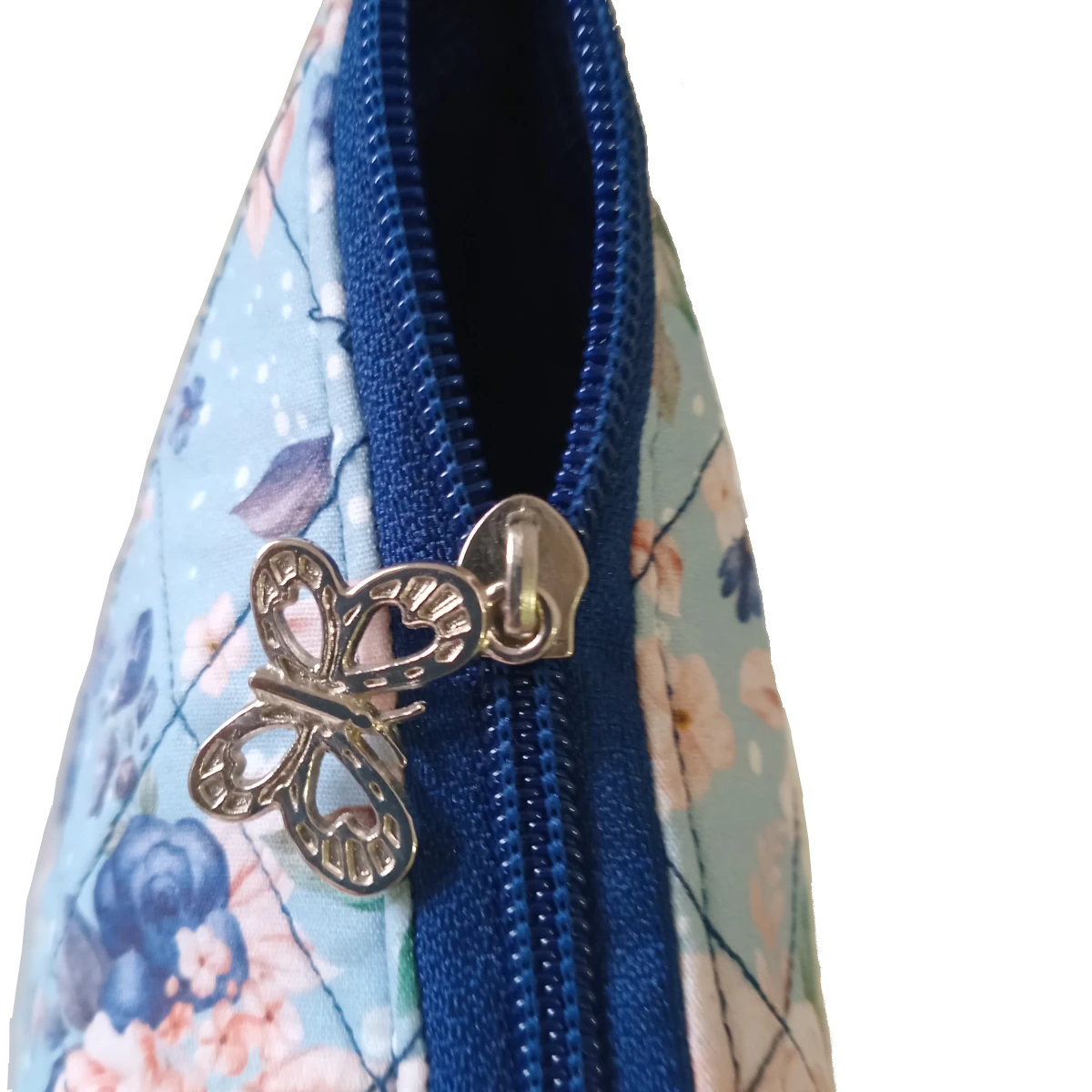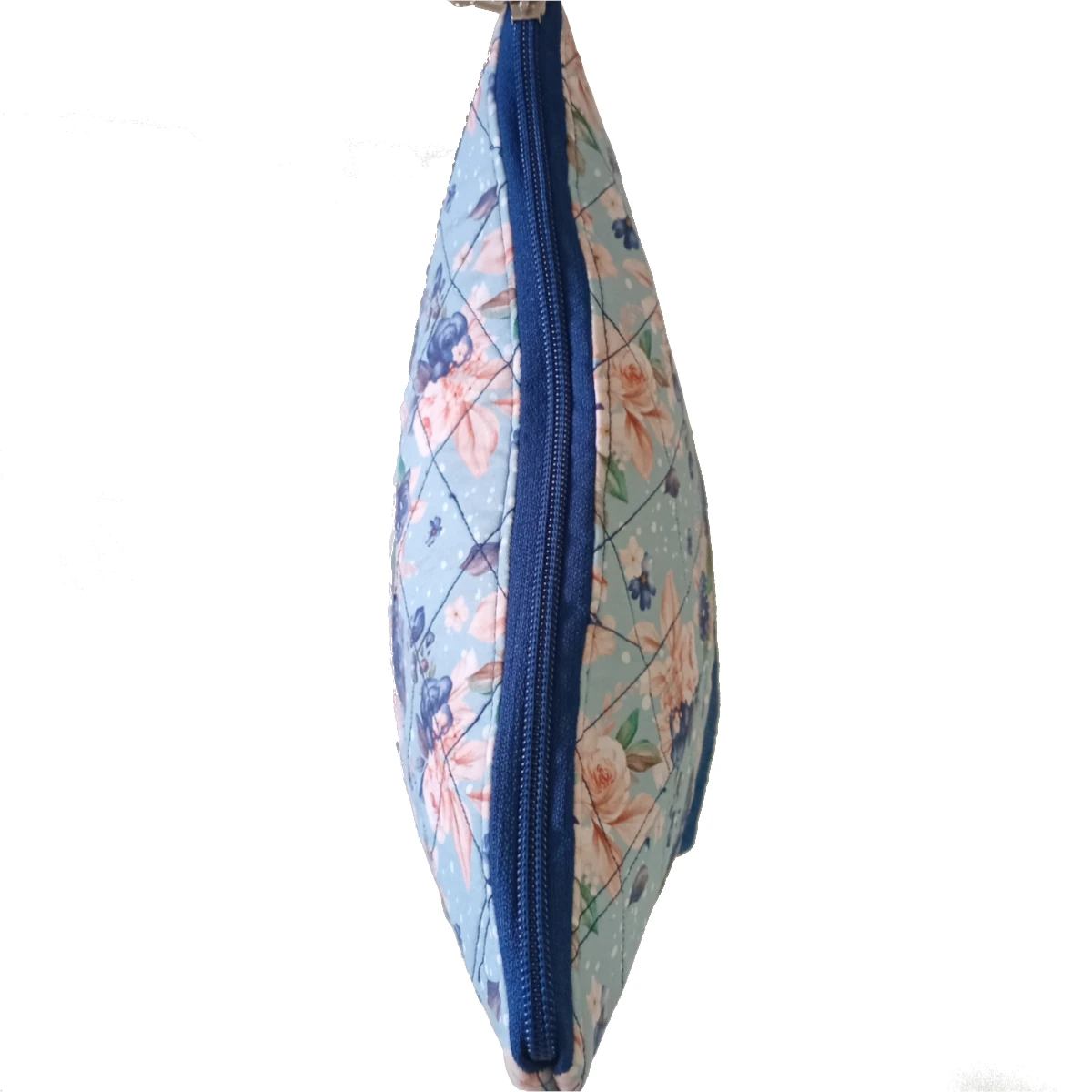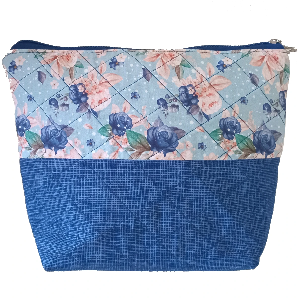 O grande diferencial desta necessaire é o seu design em composê de tricoline, uma tendência que une duas estampas que se complementam de forma sofisticada. A metade superior apresenta o tecido de tricoline alegre, estampado com delicadas flores azuis e cor de rosa — um toque de suavidade e romantismo. A parte inferior e o fundo são compostos por um elegante tricoline azul escuro, com uma discreta textura de micro xadrez, que confere um visual contemporâneo e auxilia a disfarçar o uso diário, mantendo a peça sempre linda.