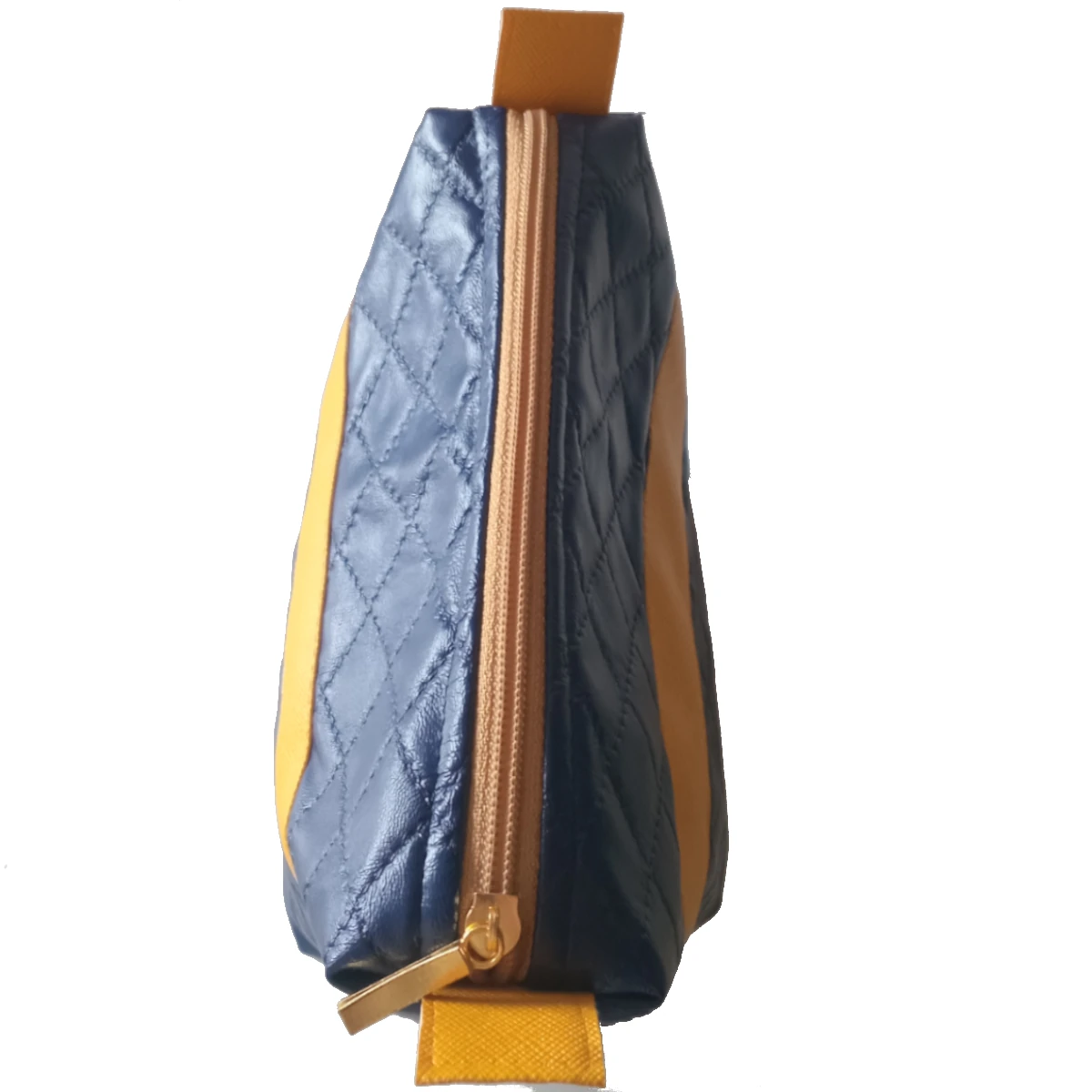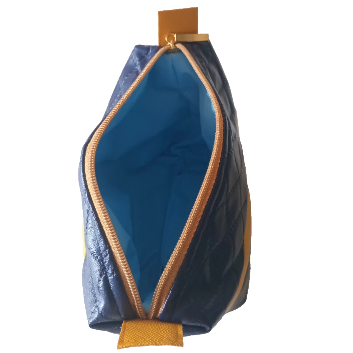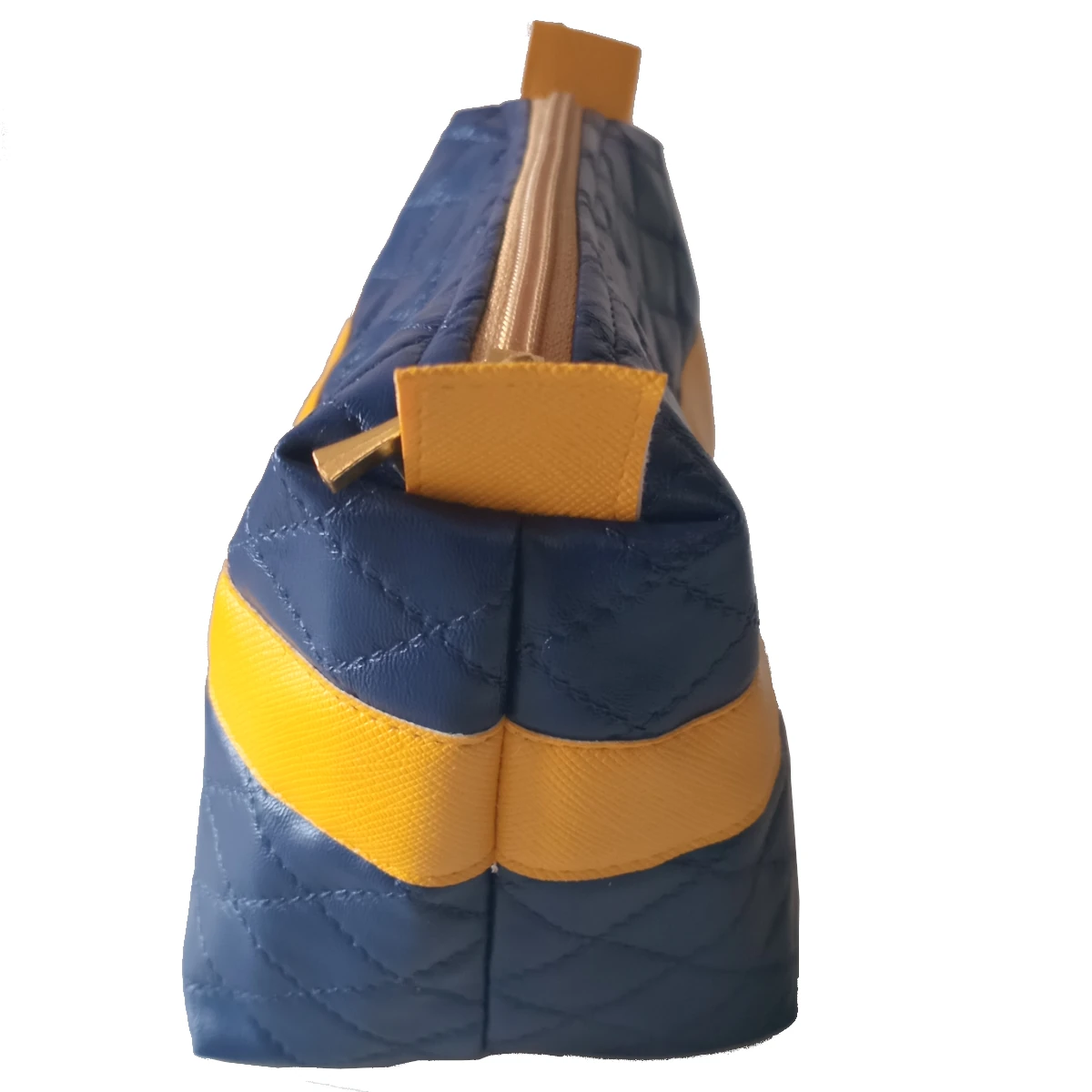 A Necessaire Blue foi cuidadosamente desenvolvida com um design interessante, elegantemente discreto, mas com um toque de ousadia. O material principal é um sintético de alta qualidade na clássica e versátil cor azul marinho, realçada por uma textura matelassada que confere um charme e uma estética de luxo à peça. Para quebrar a monotonia e adicionar um destaque vibrante, uma faixa lateral em material sintético amarelo entra em cena, criando um contraste moderno e cheio de personalidade. Esta combinação de cores faz da Necessaire Blue a escolha ideal para quem busca uma necessaire feminina que se destaca com bom gosto.