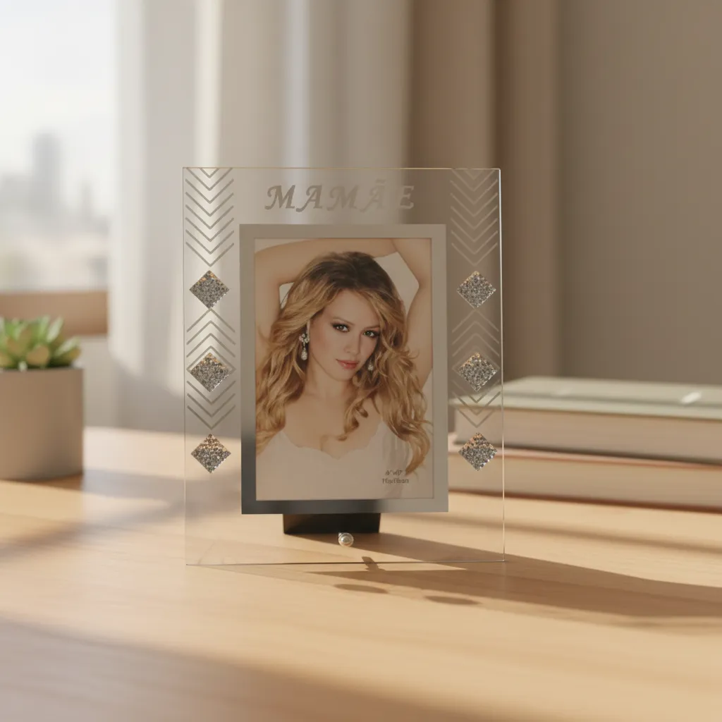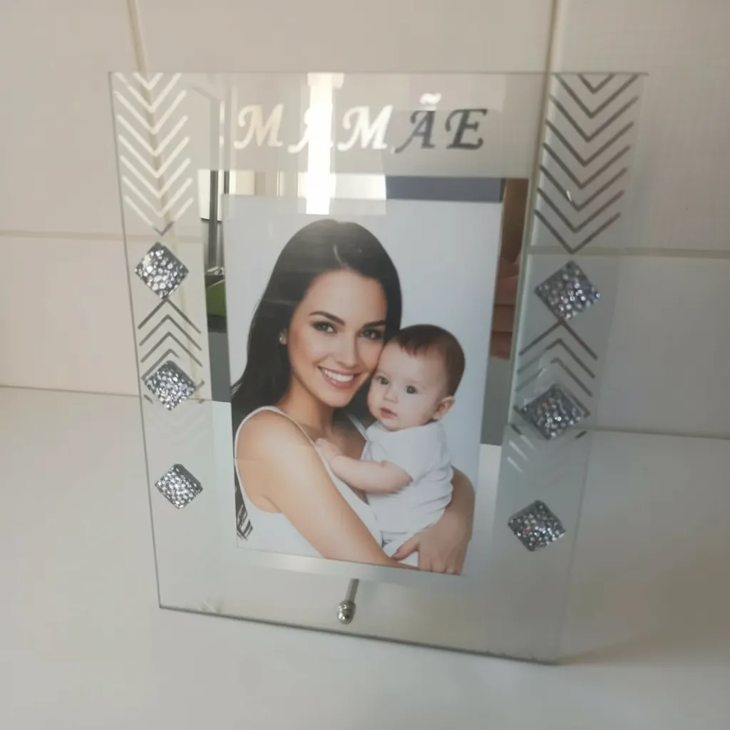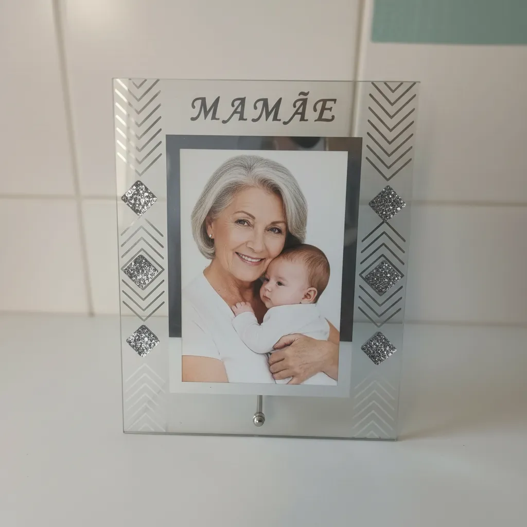 Com a delicada inscrição “Mamãe” no topo e detalhes geométricos nas laterais, este porta retrato foi criado exclusivamente para homenagear as mães. O acabamento em vidro lapidado reflete a luz de forma suave, garantindo que a foto seja o centro das atenções, mas com uma moldura que exala luxo.
